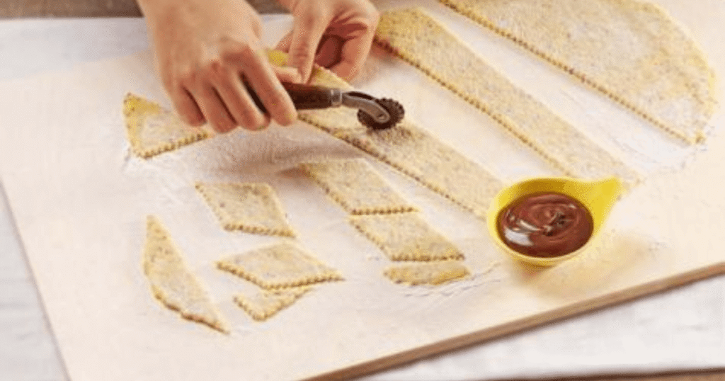 Usare un coltello o una rotella per tagliare rettangoli o losanghe. Si può praticare un piccolo taglio al centro di ogni pezzo per favorire il gonfiarsi in frittura.